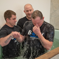 Nick Forsythe, again heart, presides over a baptism at his church. (Submitted picture)